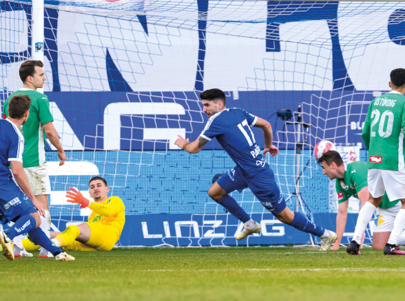 Die fatale 92. Minute in Linz, als Blau-Weiß durch Alem Pasic (Mitte/blau) den Siegestreffer gegen die WSG erzielt hatte / Foto: GEPA