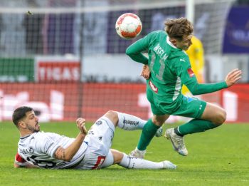 Das waren keineswegs die Ergebnisse, die sich die Kicker, der Trainer und die Fans der WSG Tirol für die finale Phase des Grunddurchgangs in der Bundesliga erwartet hatten. Der unglücklichen 2:1-Niederlage bei BW Linz durch Gegentreffer in der ersten und dann 92. Minute folgte, erneut in Linz – diesmal gegen den LASK –, eine weitere 2:1-Pleite. Fast schon selbstverständlich, dass der entscheidende Gegentreffer erst in der 94. Minute kassiert worden war. Nicht so lange hatte es im Heimspiel gegen die Wiener Austria (Bild 1) gedauert. Da hatte Andreas Gruber die Tiroler bereits in der 81. Minute mit dem vorentscheidenden 0:2 aus allen „Ausgleichsträumen“ eher unsanft geweckt. Drei Niederlagen in Serie gegen keineswegs überragend starke Gegner – ob diese Serie das Selbstvertrauen vor der spannenden Abstiegsrunde gestärkt hatte, durfte zumindest bezweifelt werden.