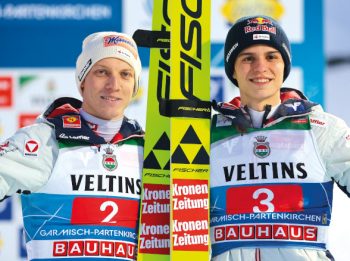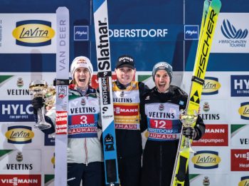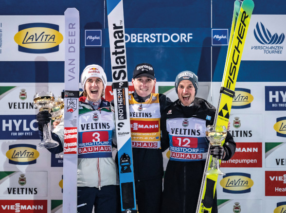 Die Vierschanzentournee 2025/26 begann mit einer Machtdemonstration: Domen Prevc (Bild 3) sprang in Oberstdorf und Garmisch-Partenkirchen in einer eigenen Liga. 17,5 Punkte Vorsprung nach dem Auftakt, 35 Zähler nach zwei Bewerben – fast 20 Meter Unterschied. Der Slowene war auf Kurs zum ersten Triumph für sein Land seit zehn Jahren und hätte sogar den Grand Slam schaffen können. „Gegen ihn ist kein Kraut gewachsen“, musste Stefan Kraft anerkennen. Daniel Tschofenig, als Zweiter in Oberstdorf (Bild 1, links) und Neunter in Garmisch bereits abgeschlagen, gab sich dennoch kämpferisch, wenngleich er auch realistisch wusste: „Wir müssen hoffen, dass er einen Fehler macht.“