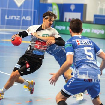 Egal, in welcher Ballsportart: Offensiv-Spektakel bringen die Zuschauer zum Staunen und die Trainer zur Weißglut. „Wir können damit aber besser leben“, freute sich Klaus Hagleitner nach dem 38:34-Erfolg (im Bild Michael Miskovez) über den zweiten Sieg der laufenden HLA-Saison.