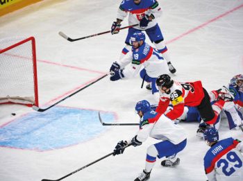 Mit dem Sieg gegen die weit höher eingeschätzte Slowakei hatte Österreichs Siegesserie bei der WM begonnen. Paul Huber (roter Dress) und Co. hatten die NHL-Stars des Nachbarn jederzeit im Griff / Foto: IMAGO/Anders Wiklund/TT