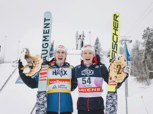 Wer soll dieses ÖSV-Springerteam denn stoppen? Diese Frage stellte sich nach der Konkurrenz von Lake Placid mehr denn je, wo die Adler von Trainer Andi Widhölzl trotz prekärer Verhältnisse wieder einen Doppelsieg gefeiert hatten. Daniel Tschofenig (links) landete knapp vor Jan Hörl (rechts). Mit diesem Ergebnis hatten die Österreicher einen neuen Rekord an Podestplätzen (39) fixiert, die bisherige Bestmarke aus dem Jahr 1998/99 überflügelt. Bei schweren Windverhältnissen behielten im ersten Durchgang nur zwei den Durchblick: Hörl lächelte von der Spitze – zwei Plätze dahinter positionierte sich Tournee-Sieger Tschofenig mit nur 1,2 Punkten Rückstand. Der Rest erlebte einen schweren Nachmittag.
