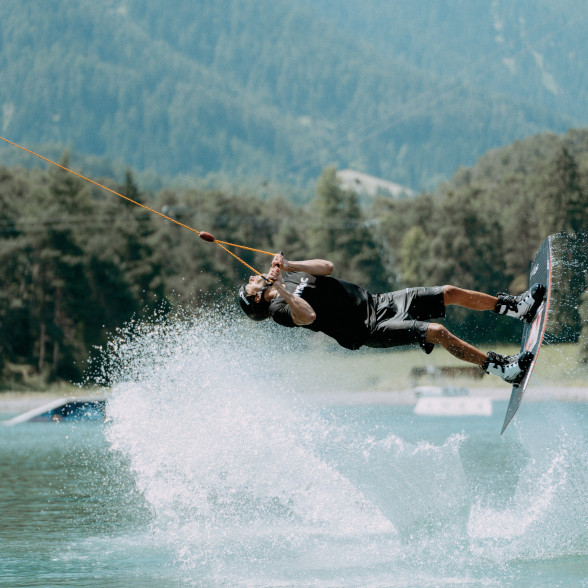 Die Wakeboarder*innen kamen in der Area 47 in den Genuss einer Abkühlung und dankten es mit einem Feuerwerk an Tricks / Foto: florianrogner photography