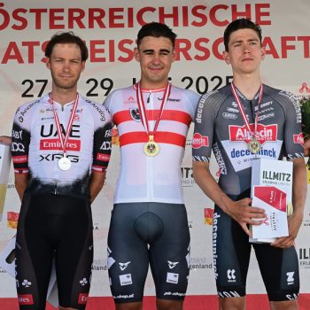 Der Schauplatz im Burgenland war auch für Tim Wafler ein guter Boden. Dort lieferte sich der Kitzbüheler (Bild Mitte im Meistertrikot) vom Tirol Cycling Team mit dem Oberösterreicher Tobias Bayer (Alpecin) und Felix Großschartner (UAE) ein Duell bis zur Ziellinie nach 172 Kilometern. Am Ende hatte Wafler die Nase vorne und holte sich Gold. „Es war mit Abstand das härteste Rennen, welches ich je gefahren bin. Österreichischer Meister, ich verstehe das noch überhaupt nicht“, freute sich Wafler nach seinem Sieg.